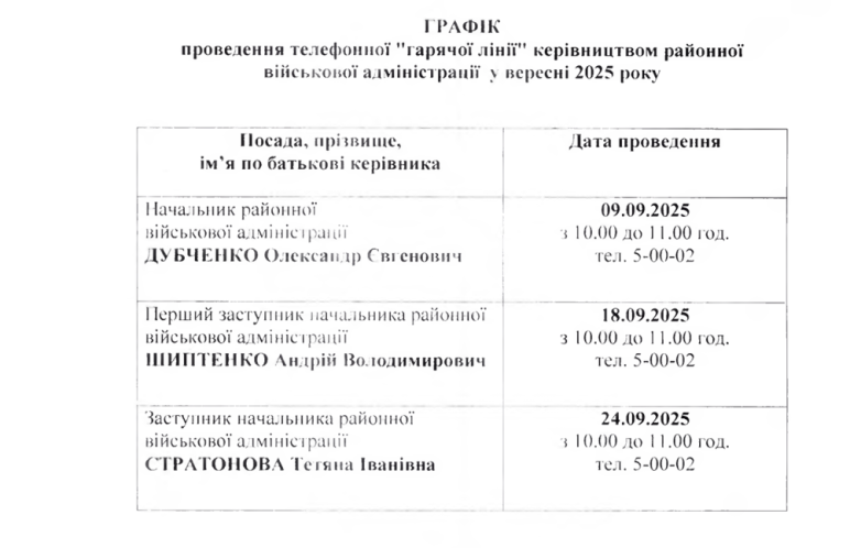 ГРАФІК проведення телефонної "гарячої лінії" керівництвом районної військової адміністрації у вересні 2025 року