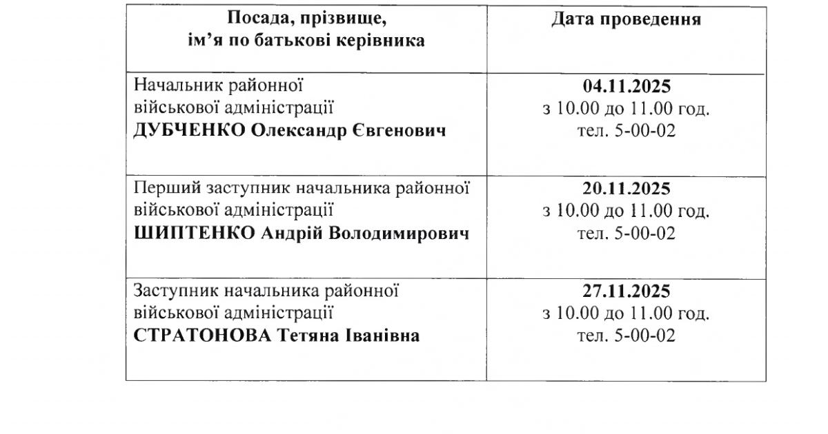 ГРАФІК проведення телефонної "гарячої лінії" керівництвом районної військової адміністрації у листопаді 2025 року