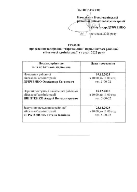 ГРАФІК проведення телефонної "гарячої лінії" керівництвом районної військової адміністрації у грудні 2025 року
