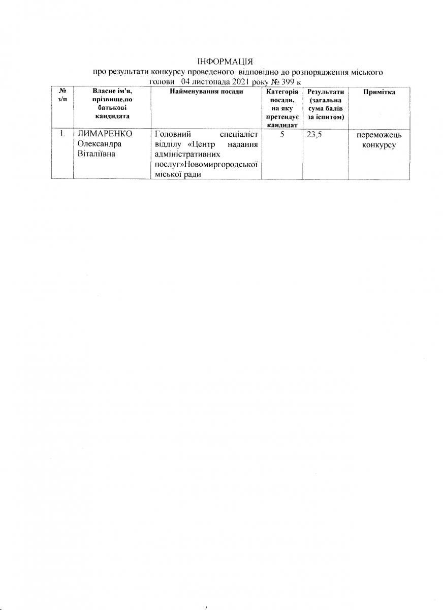Про результати конкурсу проведеного відповідно до розпорядження міського голови 04 листопада 2021 року № 399 к