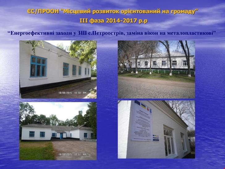 • «Енергоефективні заходи у ЗШ с.Петроострів, заміна вікон на металопластикові». Загальна вартість проекту – 277,6 тис.грн., з яких кошти ПРООН – 208,2 тис.грн.