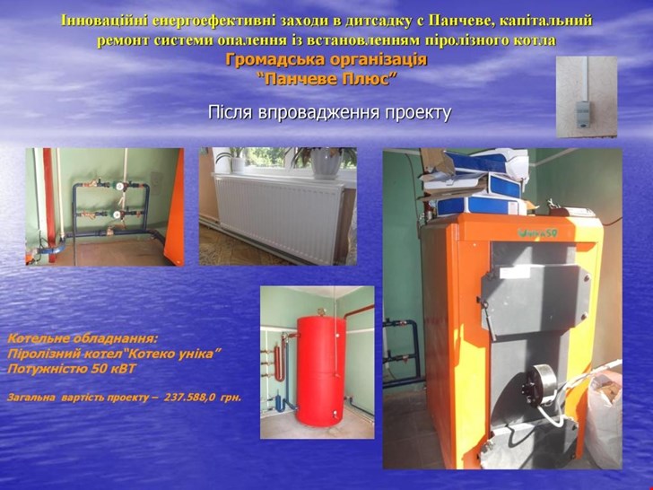 • Інноваційні енергоефективні заходи в дитсадку с.Панчеве, капітальний ремонт системи опалення із встановленням піролізного котла – 237,6 тис.грн., з яких кошти ПРООН – 118,3 тис.грн.