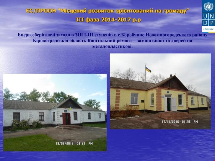 • «Енергозберігаючі заходи у ЗШ І-ІІІ ступенів в с.Коробчине Новомиргродського району Кіровоградської області. Капітальний ремонт - заміна вікон та дверей на металопластикові». Загальна вартість проекту – 280,0 тис.грн., з яких кошти ПРООН – 121,0 тис.грн.