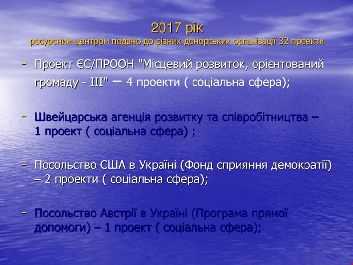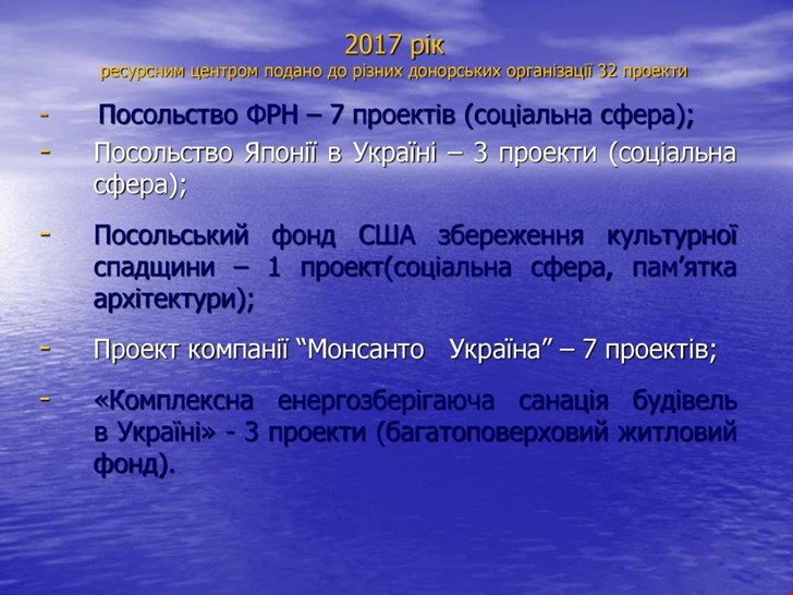 Протягом 2014-2017 років за сприяння ГО «Ресурсно-інвестиційний центр розвитку громад «Територія успіху», координатором якого є Ігор Забажан, реалізовано більше 20 міжнародних проектів: