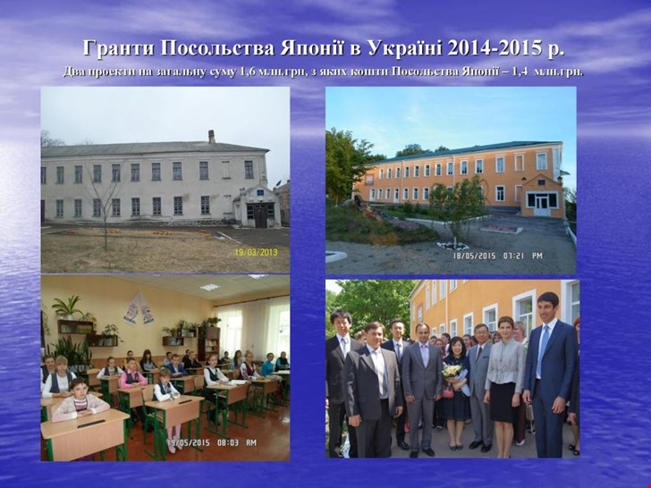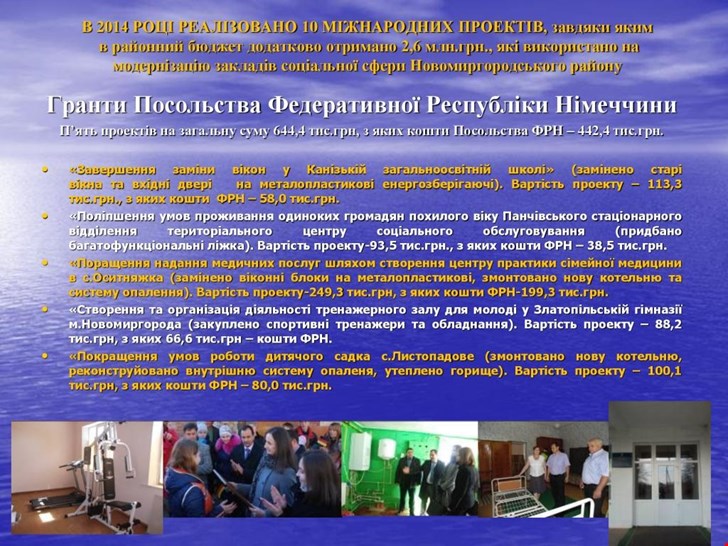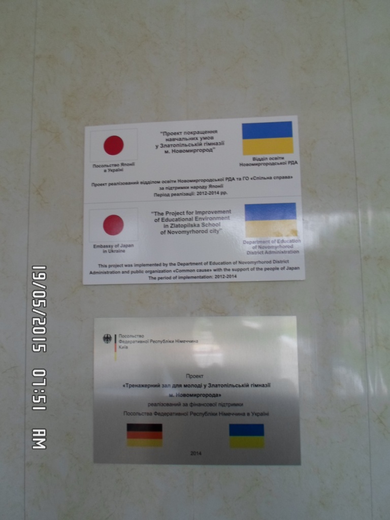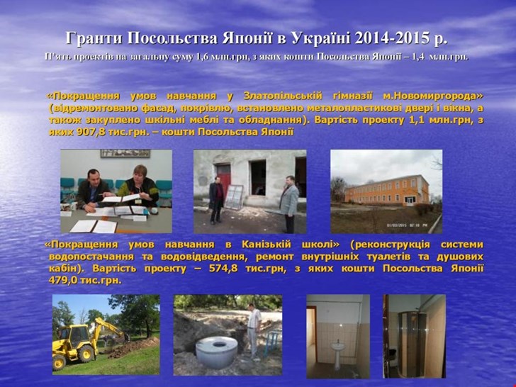 • «Покращення умов навчання учнів у Златопільській гімназії м.Новомиргорода» (відремонтовано фасад, покрівлю, встановлено металопластикові двері і вікна, закуплено шкільні меблі та обладнання). Вартість проекту – 1,1 млн.грн., з яких 907,8 тис.грн. - кошти Посольства Японії.