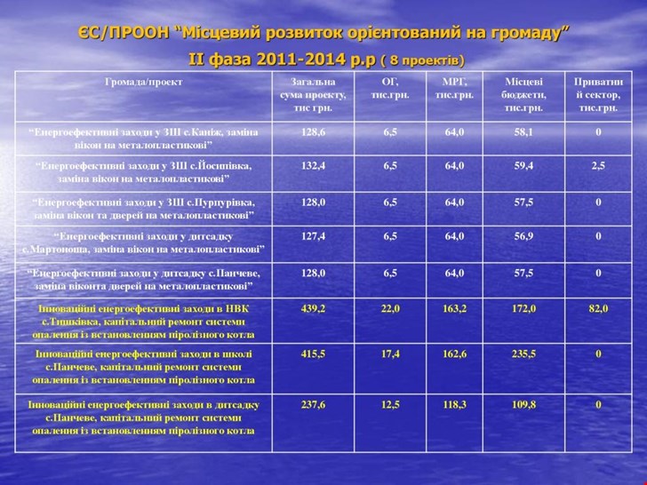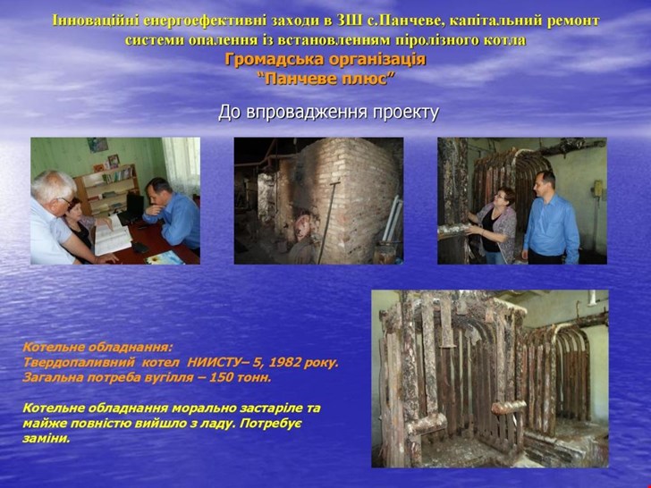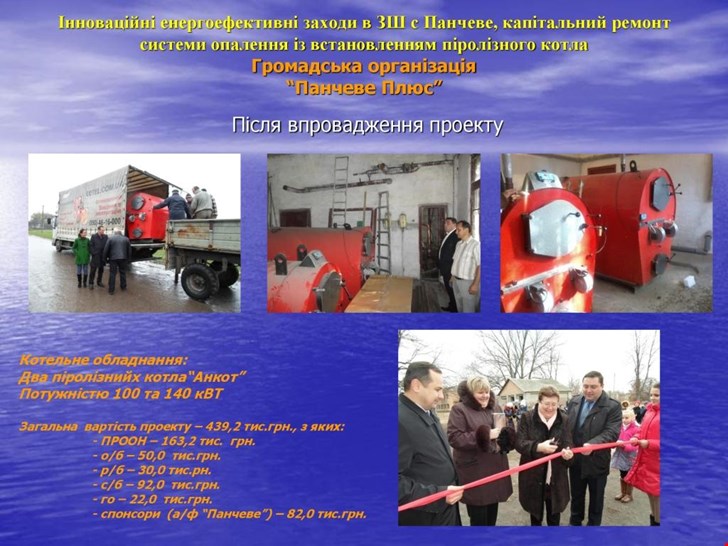 • Інноваційні енергоефективні заходи в школі с.Панчеве, капітальний ремонт системи опалення із встановленням піролізного котла». Загальна вартість проекту – 415,0 тис.грн., з яких кошти ПРООН – 162,6 тис.грн.