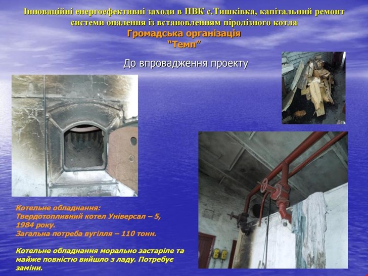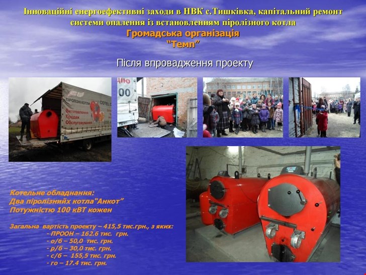 • «Інноваційні енергоефективні заходи в НВК с.Тишківка, капітальний ремонт системи опалення із встановленням піролізного котла». Загальна вартість проекту – 439,2 тис.грн, з яких кошти ПРООН – 163,2 тис.грн.