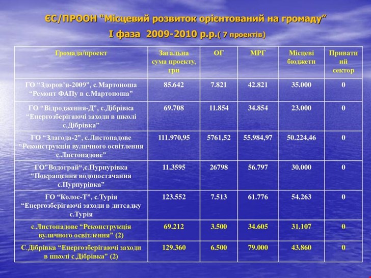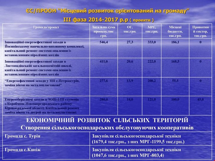 • Створення сільськогосподарського обслуговуючого кооперативу в с.Турія (закупіля сільськогосподарської техніки). Загальна вартість проекту –1,7 млн.грн., з яких кошти ПРООН – 1,2 млн.грн.