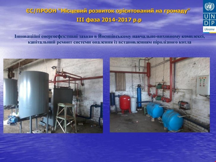• Інноваційні енергоефективні заходи в Йосипівському навчально-виховному комплексі, капітальний ремонт системи опалення із встановленням піролізних котлів». Загальна вартість проету – 546,4 тис.грн., з яких кошти ПРООН –333,0 тис.грн.