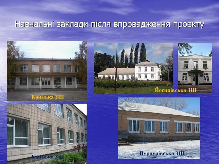 • «Завершення заміни вікон у Канізькій загальноосвітній школі» (замінено старі вікна на металопластикові енергозберігаючі). Вартість проекту - 113,3 тис.грн., з яких кошти ФРН – 58,0 тис. грн.