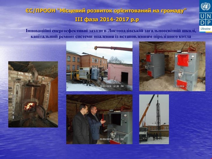• Інноваційні енергоефективні заходи в Листопадівській загальноосвітній школі, капітальний ремонт системи опалення із встановленням піролізних котлів». Загальна вартість проекту – 411,0 тис.грн, з яких кошти ПРООН – 222,0 тис.грн.