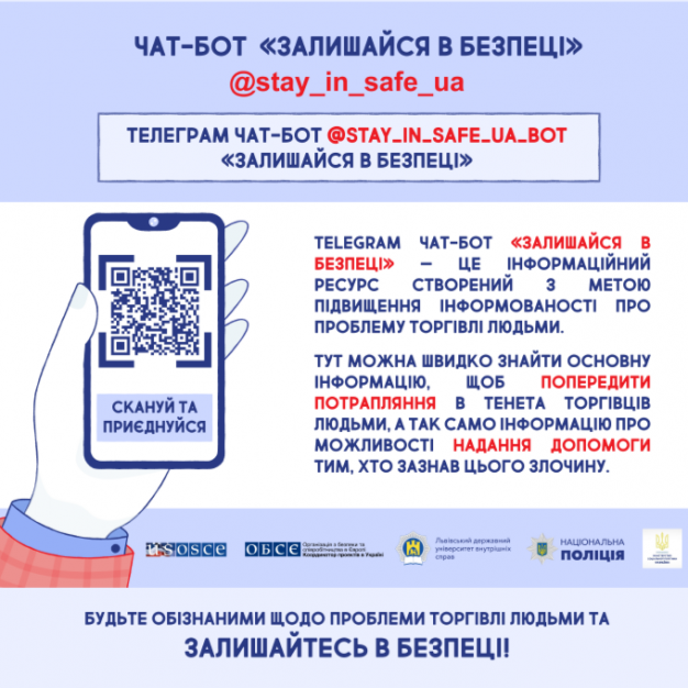 Хочемо нагадати про тематичний чат-бот у телеграм «Залишайся в безпеці». Це інформаційний ресурс для тих, хто знаходиться в пошуках роботи, навчання, подорожей, нових знайомств, в тому числі віртуальних.