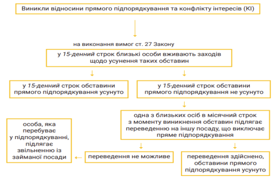 - якщо в зазначений строк ці обставини добровільно не усунуто відповідні особи або близькі їм особи в місячний строк з моменту виникнення обставин підлягають переведенню в установленому порядку на іншу посаду, що виключає прямее підпорядкування.