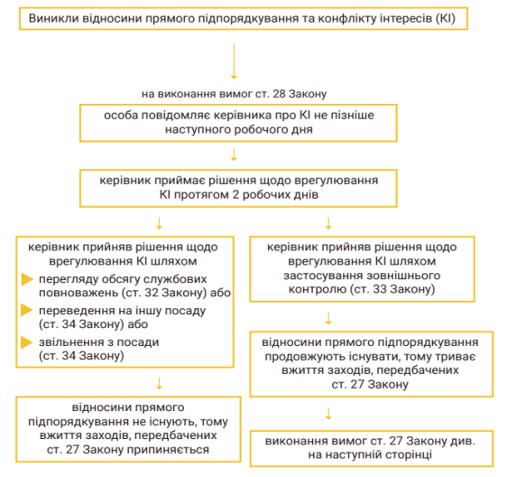 Якщо як захід врегулювання конфлікту інтересів буде обрано перегляд службових повноважень, переведення особи на іншу посаду або звільнення, надалі буде відсутня потреба в застосуванні передбачених ст. 27 Закону механізмів усунення відносин прямого підпорядкування, оскільки такі заходи врегулювання конфлікту інтересів усувають відносини прямого підпорядкування.