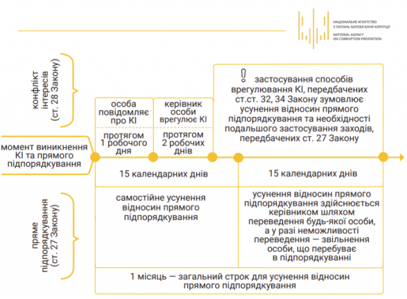 При цьому слід враховувати, що час для виконання вимог ст. 28 Закону є більш обмеженим (повідомлення про конфлікт інтересів здійснюється не пізніше наступного робочого дня з моменту виявлення, а врегулювання конфлікту інтересів – протягом 2-х робочих днів з дня отримання повідомлення), ніж час для усунення обставин прямого підпорядкування близьких осіб (до 1 місяця з моменту виникнення обставин).